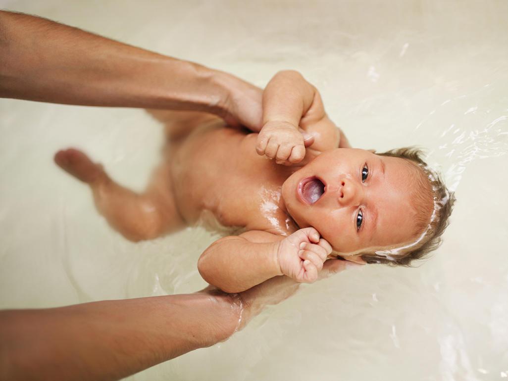 Cho bé tắm giúp làm dịu da và đánh lạc hướng bé khỏi cơn đau nếu mẹ chọn nước tắm có nhiệt độ phù hợp với bé. Hãy pha nước tắm cho bé với nhiệt độ thấp hơn một chút so với người trưởng thành vì da của bé rất nhạy cảm. Bên cạnh đó, các nhà khoa học khẳng định, mẹ có thể trộn một chút baking soda vào nước tắm của bé sẽ giúp trung hòa các axit có thể góp phần gây ra phát ban.