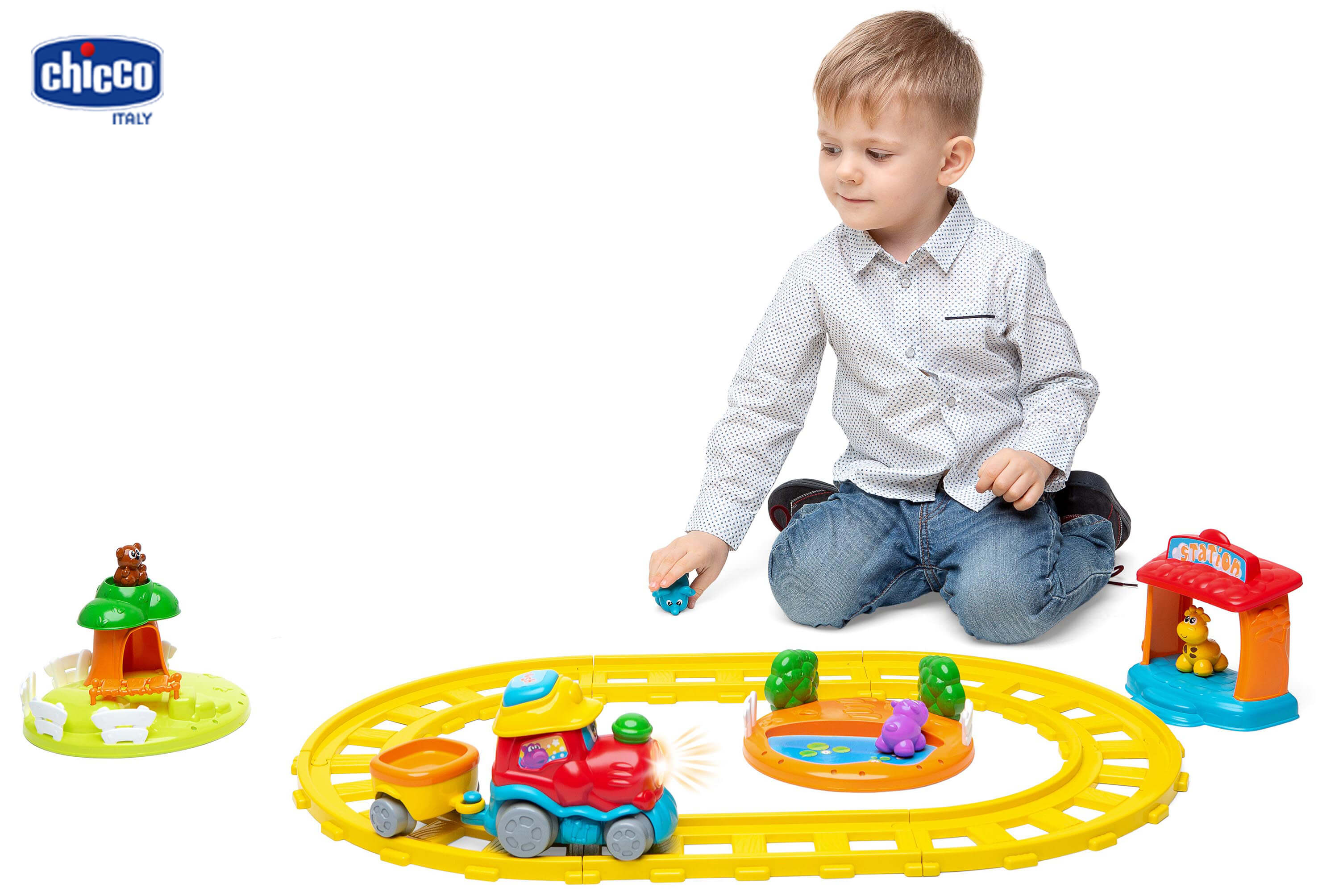 - Nhấn nút Push màu xanh trên chiếc mũ của Đầu tàu để khởi động con tàu. Âm thanh của đoàn tàu sẽ phát lên cùng bài hát, bé chọn từng hành khách đưa lên toa chở khách. Đoàn tàu sẽ bắt đầu di chuyển trên đường ray.