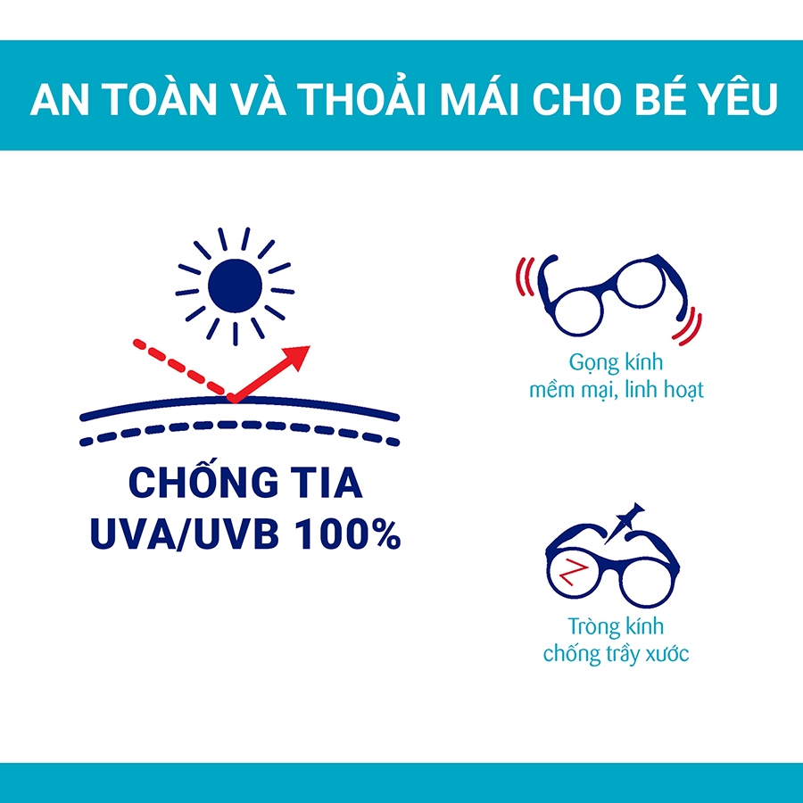 - Loại bỏ 100% các tia UVA và tia UVB: Cấu tạo mắt kính có bộ lọc loại 3 và lớp quang học loại 1 giúp loại bỏ tối đa các tia UVA, UVB, bảo vệ tối ưu cho đôi mắt Bé.