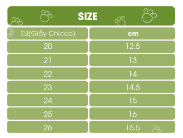 • Size: 20, 21, 22, 23, 24, 25, 26 (số size được tính bằng độ dài bàn chân bé, đo bằng cm)