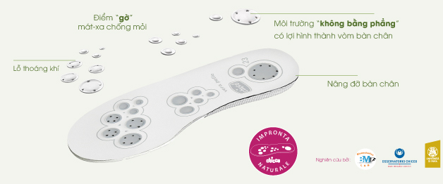 Trong những giai đoạn đầu đời tập đi, để hình thành vòm chân phát triển bình thường, bé rất cần được tạo môi trường “không bằng phẳng” tự nhiên nhằm tác động vào những điểm vàng nối liền tạo nên vòm bàn chân. Từ quá trình nghiên cứu đó, Chicco đã phát minh ra “Tấm lót mát-xa – Natural Footprint Chicco” và được cấp bằng sáng chế độc quyền.