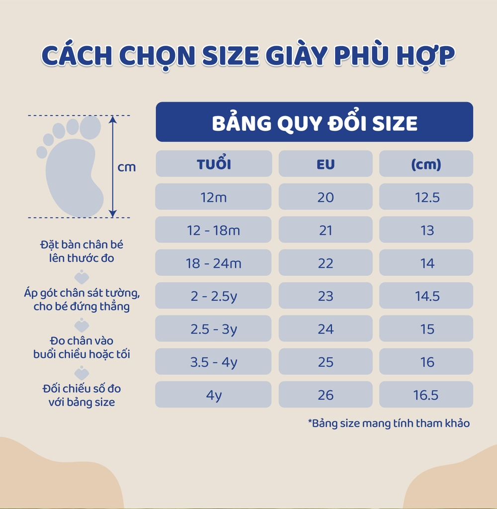 Size: 21 đến 26 (số size được tính bằng độ dài bàn chân bé, đo bằng cm)